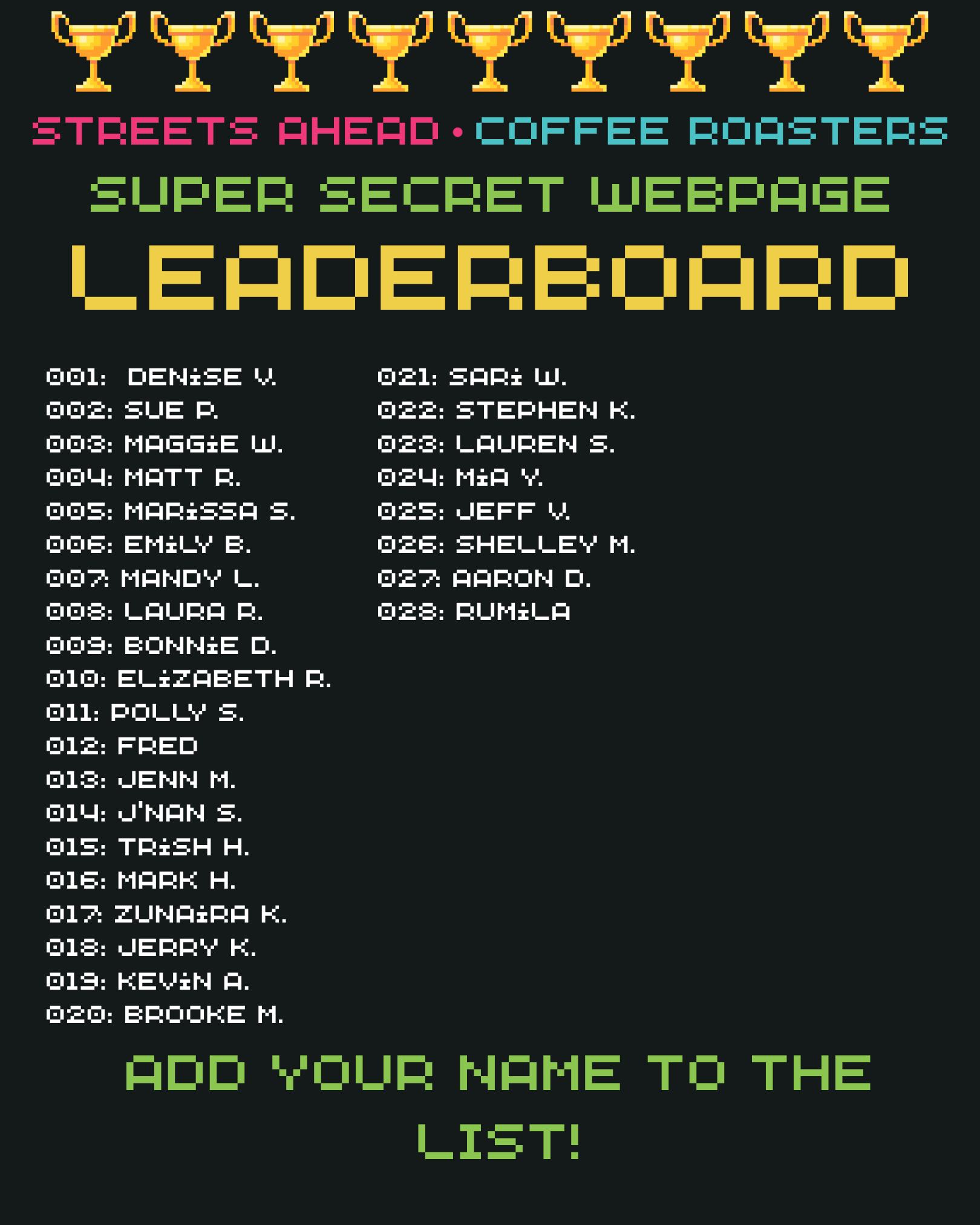 If you enter your name in the form below and include Coffee Ninja in the message, we will add your name to the legendary leaderboard, and also write you back to congratulate you for joining the Super Secret Website Page Club!